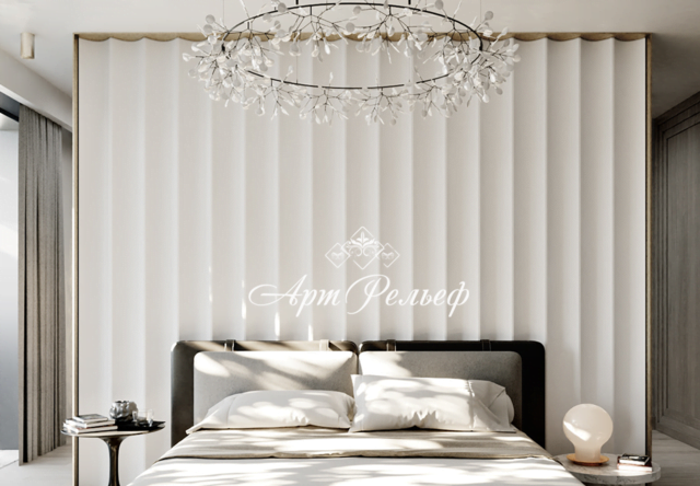 • не є токсичною, екологічно чиста;За допомогою декоративних панелей із гіпсу дизайнери розширюють простір та візуально змінюють розміри кімнати. Для цього вибирайте панелі з вертикальним малюнком, який витягне кімнату і підніме стелі. Не забувайте про підсвічування, яке підкреслить і виділить рельєф. Простір додадуть панелі світлих відтінків, а темних – солідності.